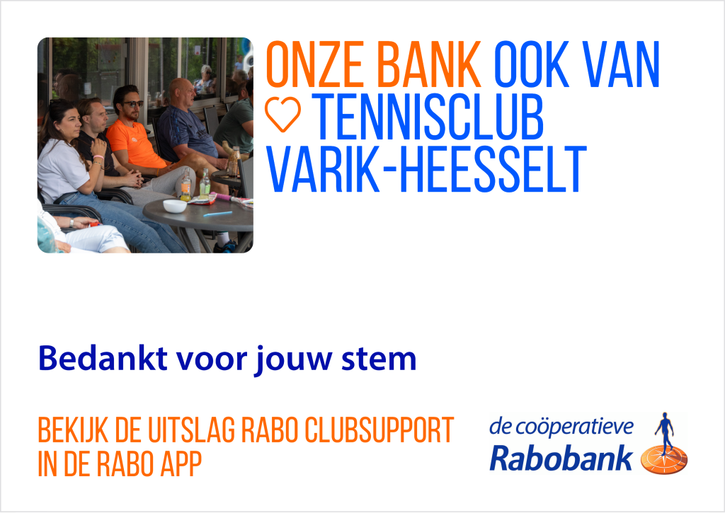 De Rabo Clubsupport-actie is afgerond op 24 september. Op donderdagavond 9 oktober maakte Rabobank West Betuwe de uitslagen feestelijk bekend. Tennisclub Varik-Heesselt ontvangt die jaar EUR 907,59 voor ons voorstel "Een tennismuur met ballen!". Een supermooi bedrag! Dank aan iedereen die voor ons voorstel heeft gestemd.